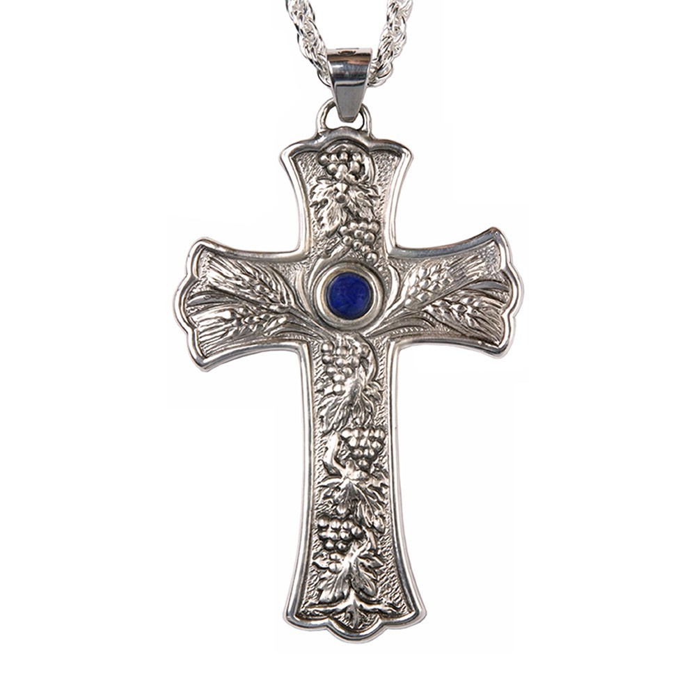 925 sterling silver pectoral cross with a blue stone placed at the center of the cross.