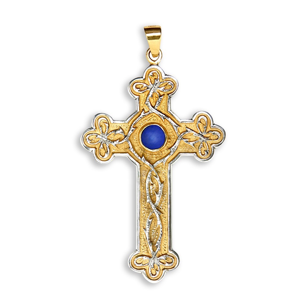 925 sterling silver pectoral cross with a blue stone placed at the center. Measures 10x6 cm.