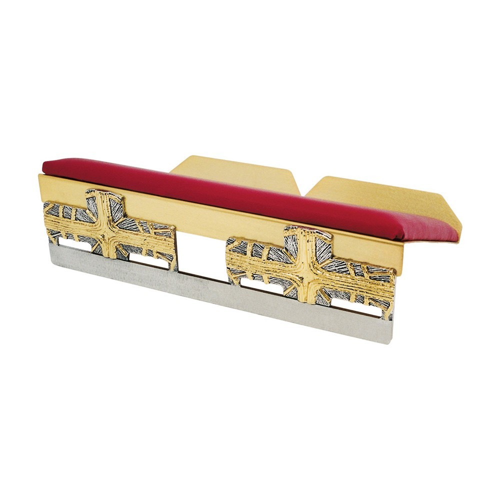 Book stand in two-tone brass. The front of the book stand is richly decorated with golden crosses and silver rays of light on the background. The book stand has a size of 38x25 cm and is provided with a red cushion in fake leather.
