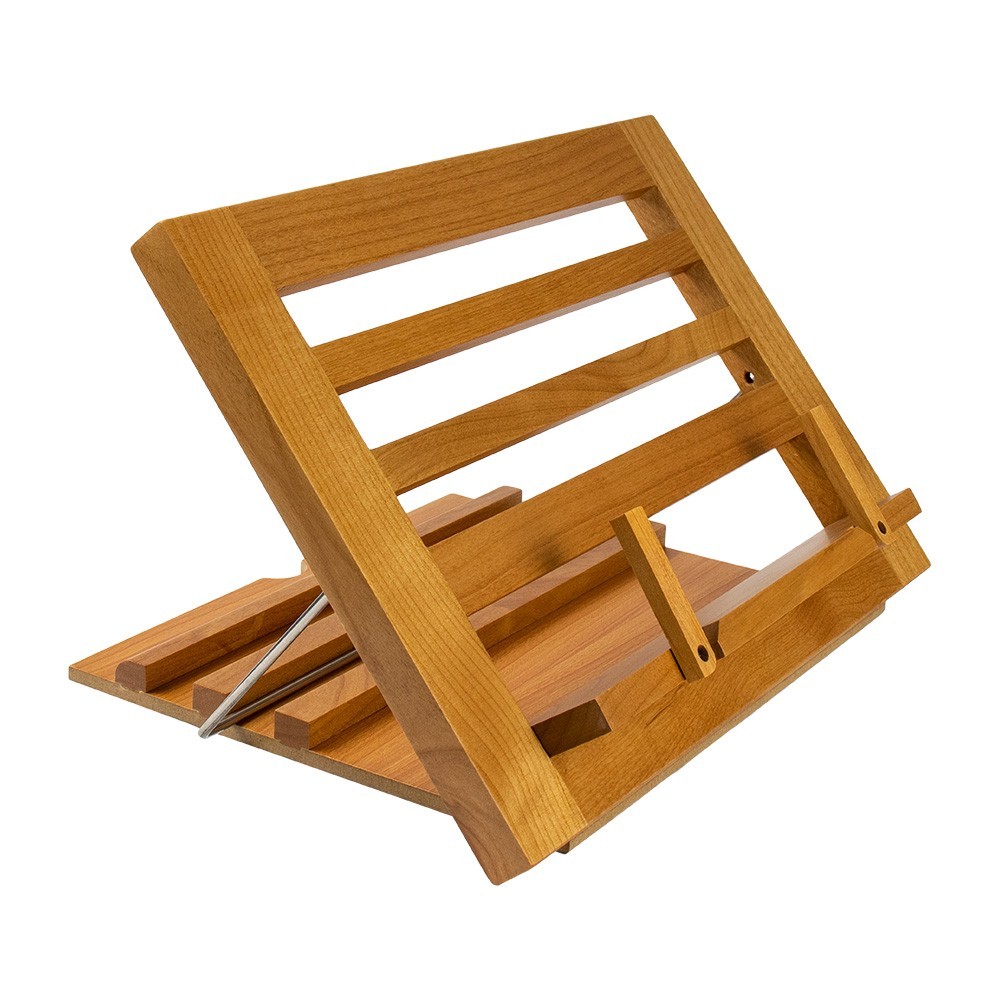 Adjustable book stand provided with practical page holders. The height can be adjusted by means of a silver metal piece on the back.