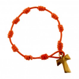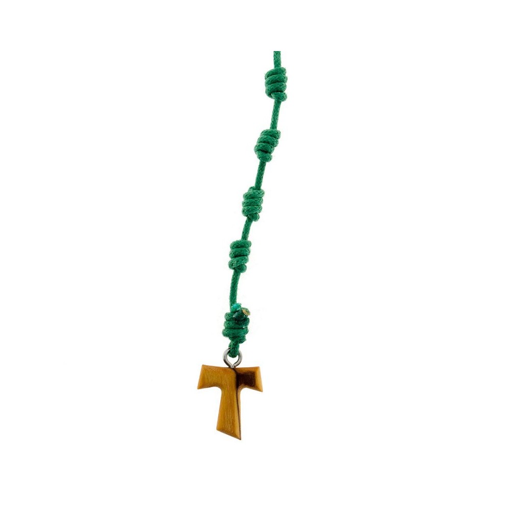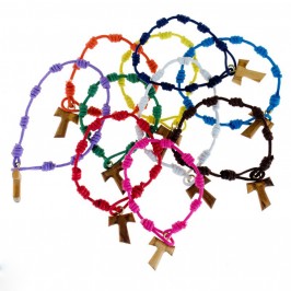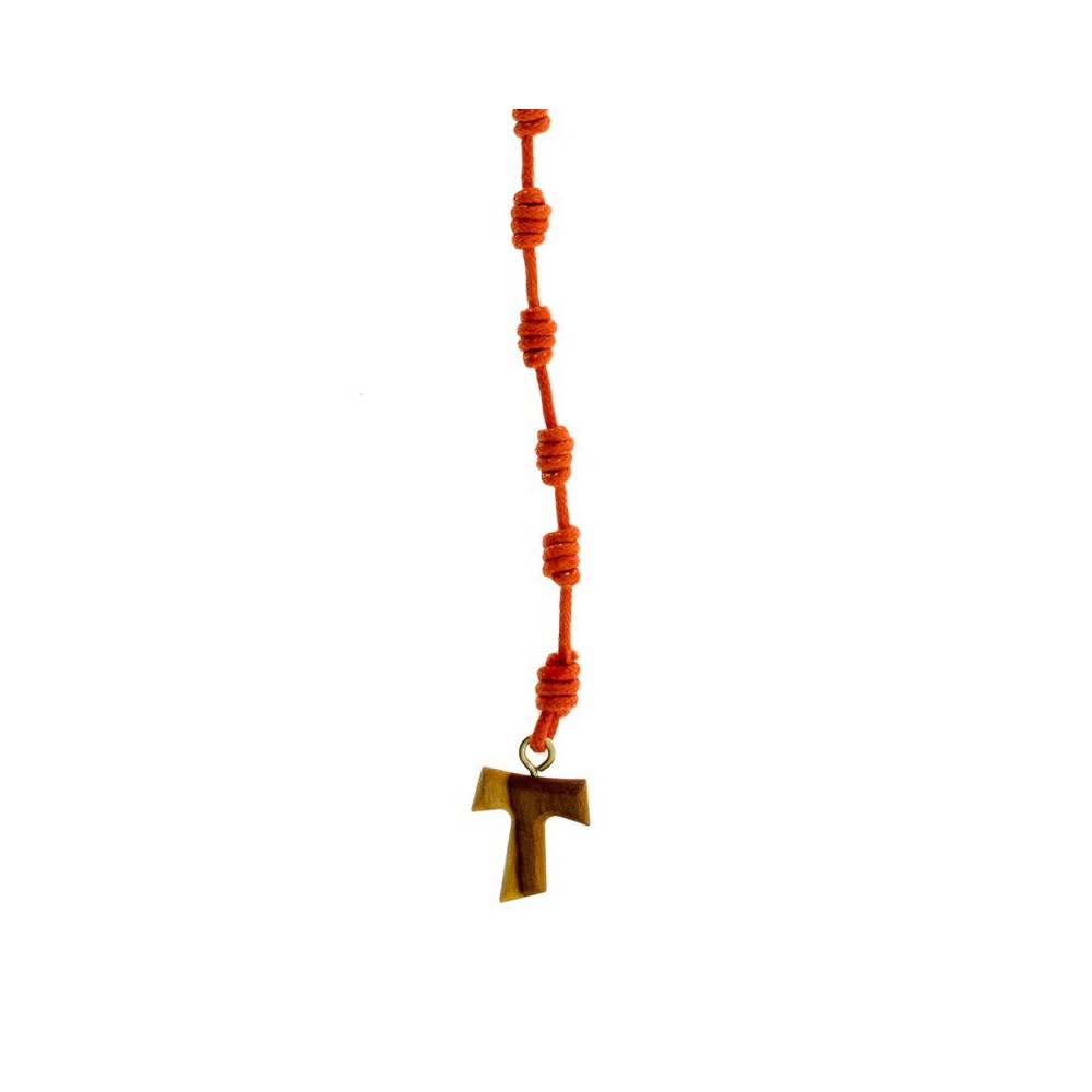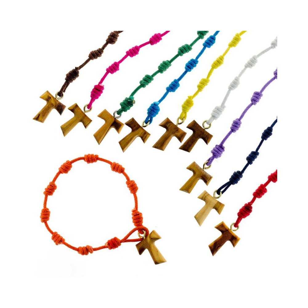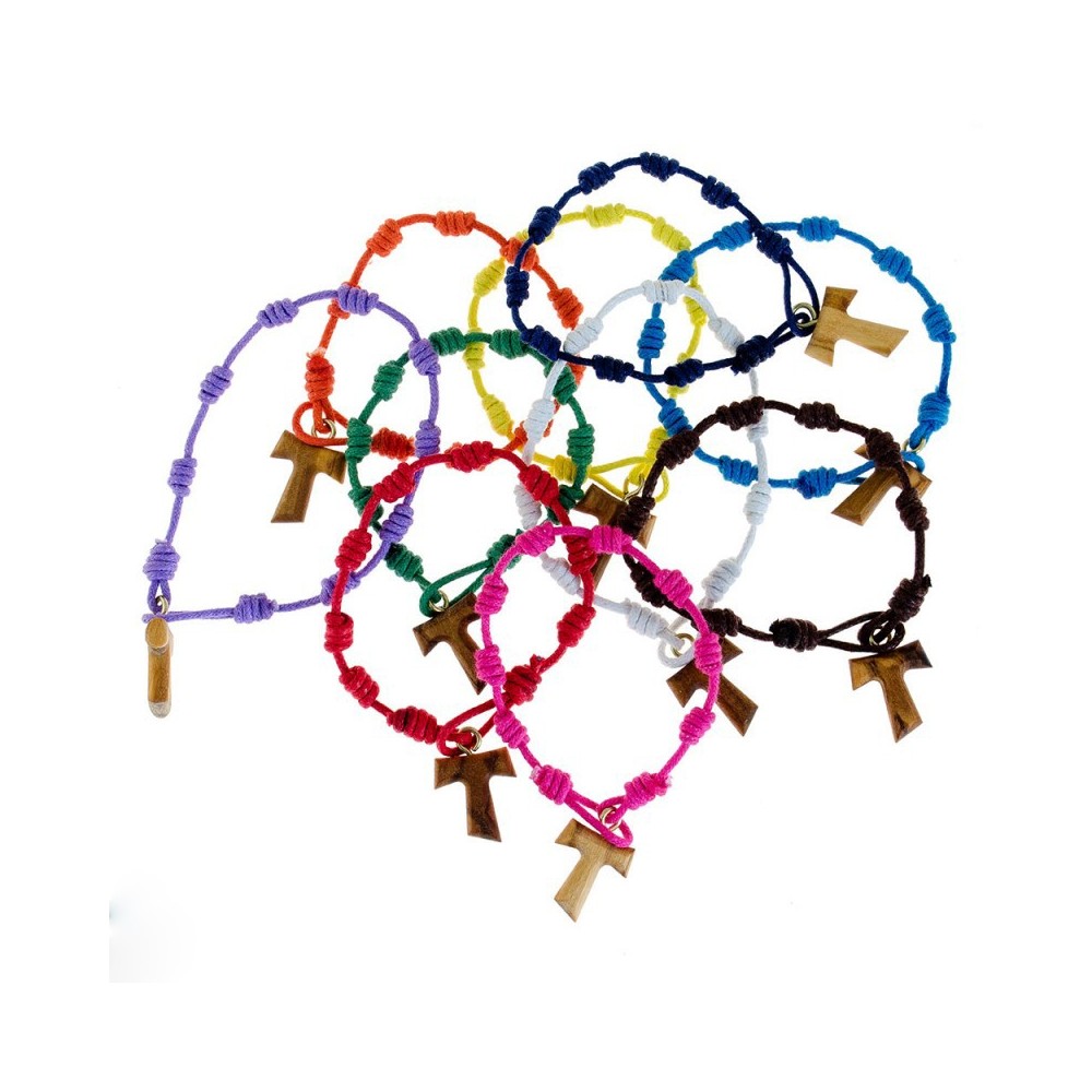 One decade rosary bracelet in rope of assorted colors and Tau Cross in olive wood.