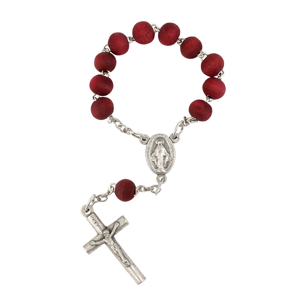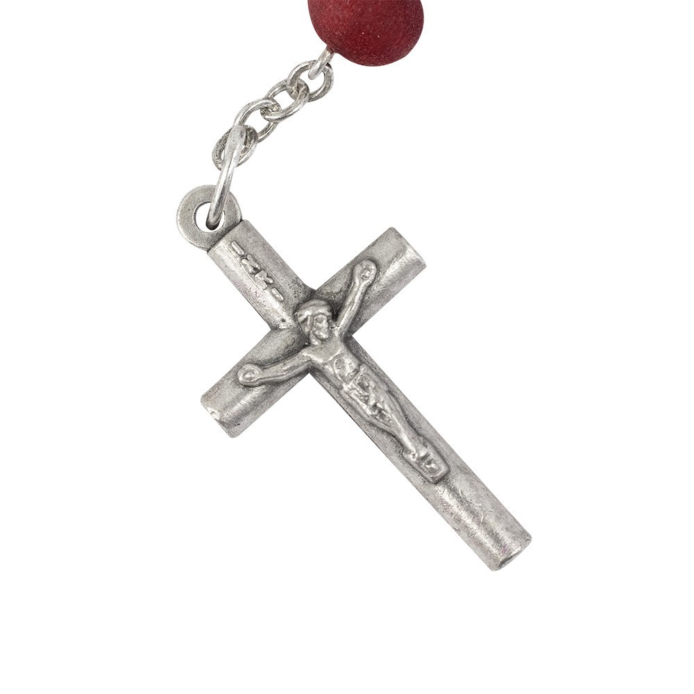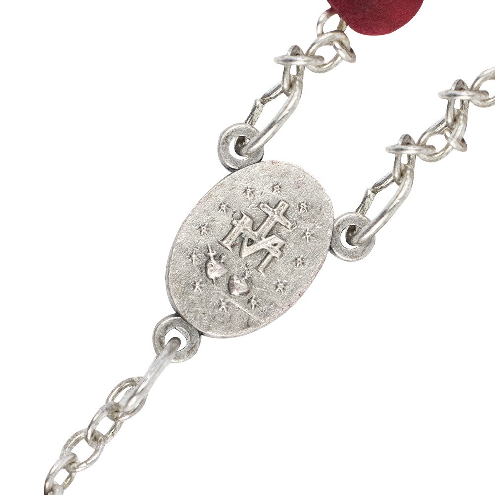 One decade rosary with rose petal scented grains. The grains are round and colored in red. Binding, crucifix and centerpiece are made of silver metal.