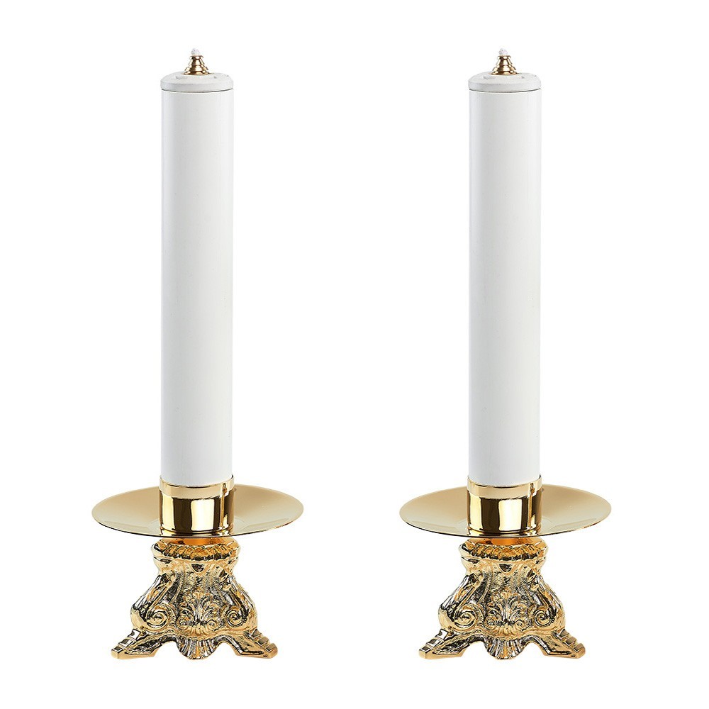 Pair of altar candle holders made of cast brass in baroque style. Complete with liquid candles and refillable containers. Product of excellent quality entirely made in Italy.