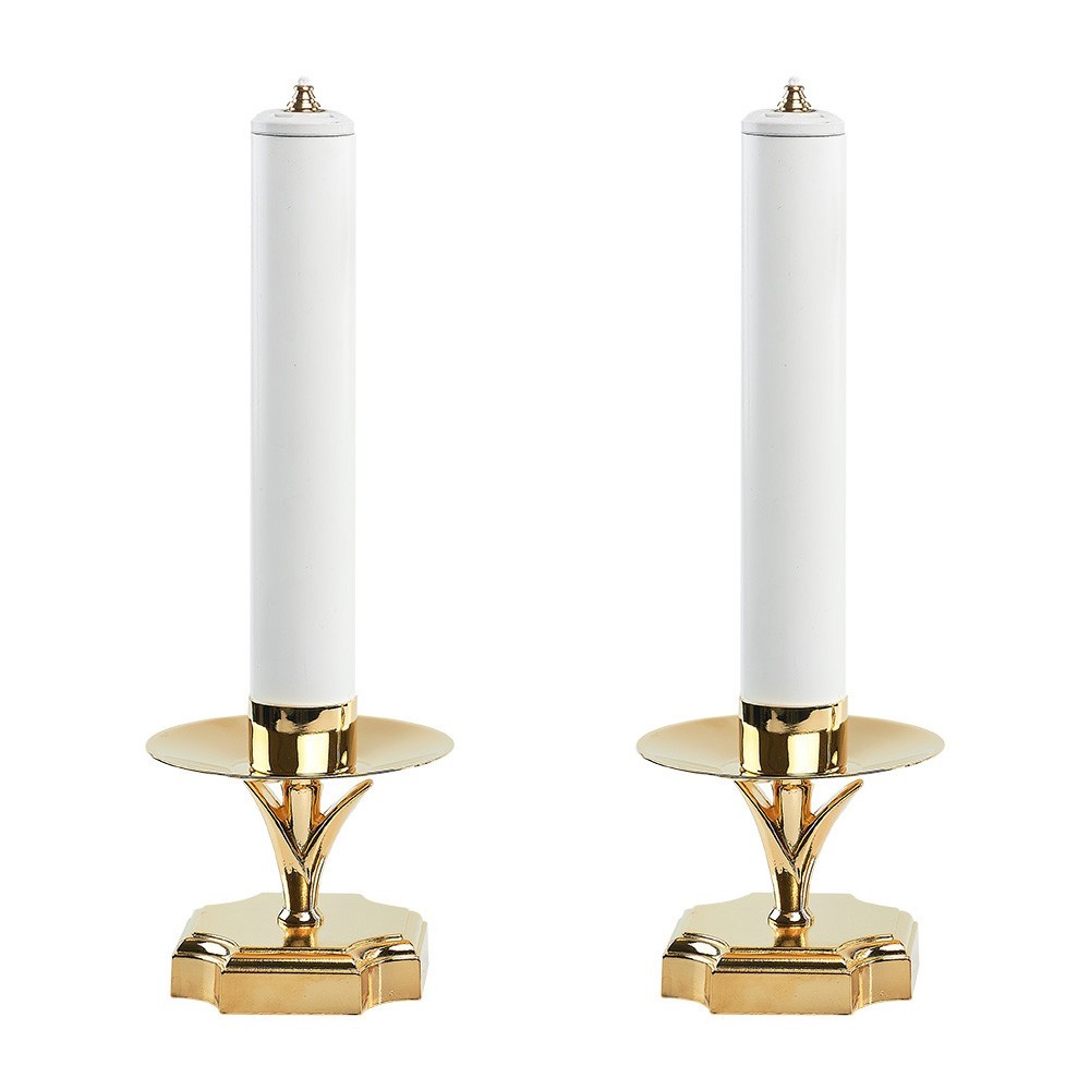 Pair of altar candle holders with square base. These candle holders are made of golden brass. Complete with liquid candles and refillable containers. Made in Italy.