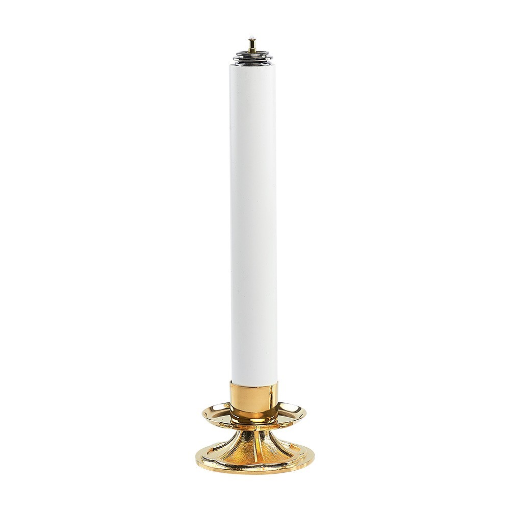 Altar candle holder in golden brass. Suitable to hold liquid candles with a maximum diameter of 3.2 cm. Made in Italy.