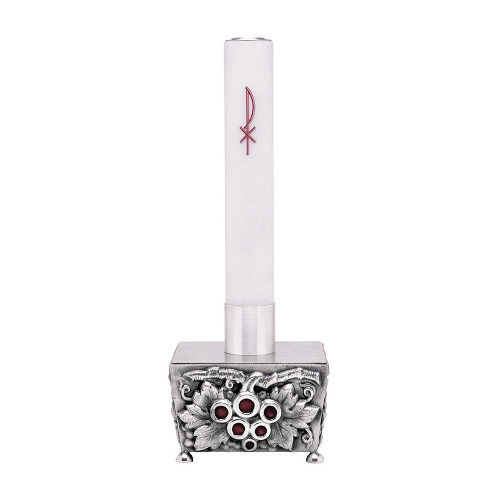 This beautiful altar candle holder is entirely made of silver-plated bronze and is decorated with bunch of grapes and red enamel. It does not contain nickel. This product is made by an Italian, ensuring high-quality materials and craftsmanship.