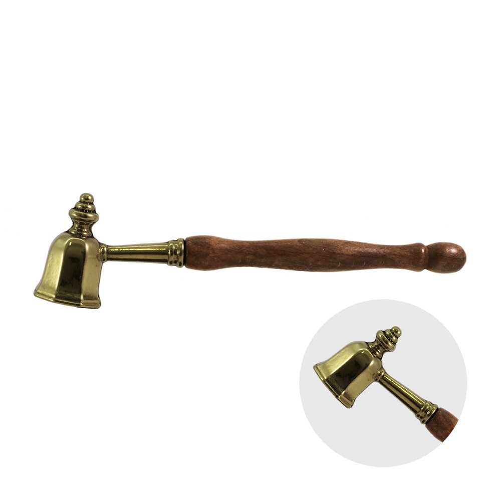 Candle snuffer in golden brass with wooden handle. Length: 21 cm.