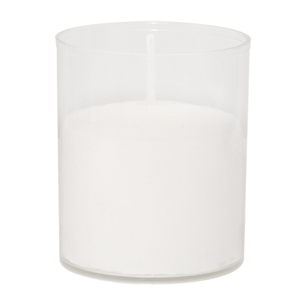 White wax tea light candle with transparent plastic container.