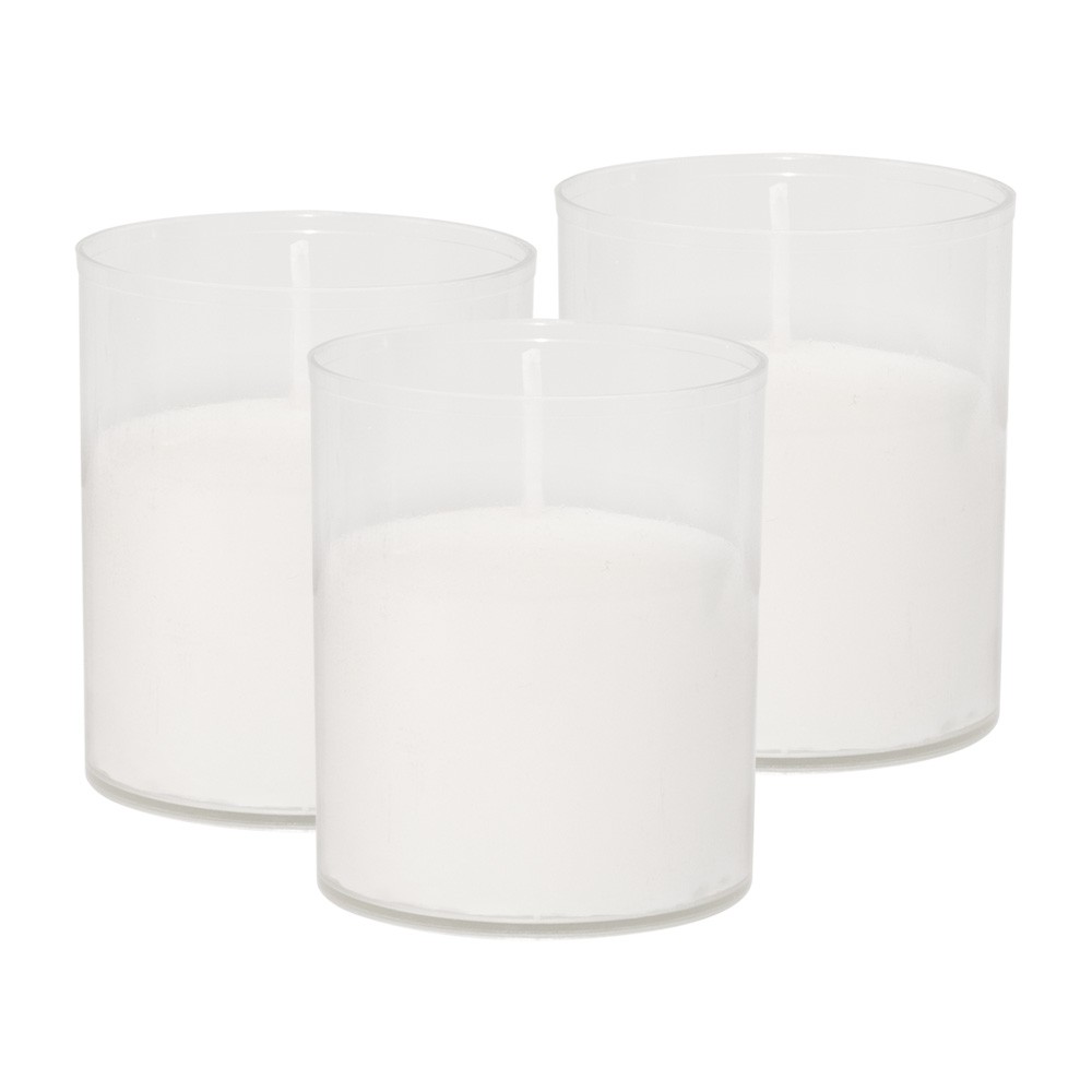 Tea light candle in transparent plastic container, 6 cm tall.