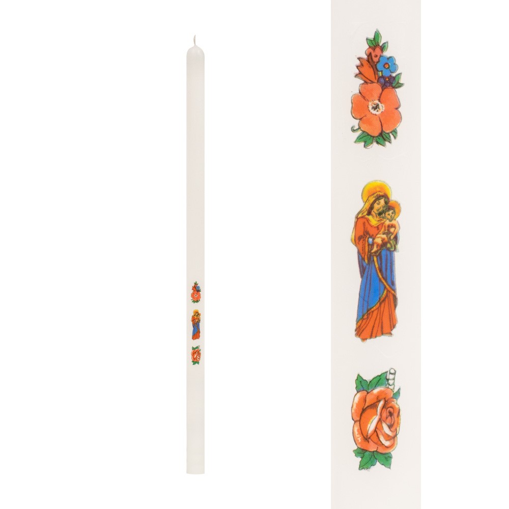 Wax candle with decal depicting Our Lady with the child and two roses.