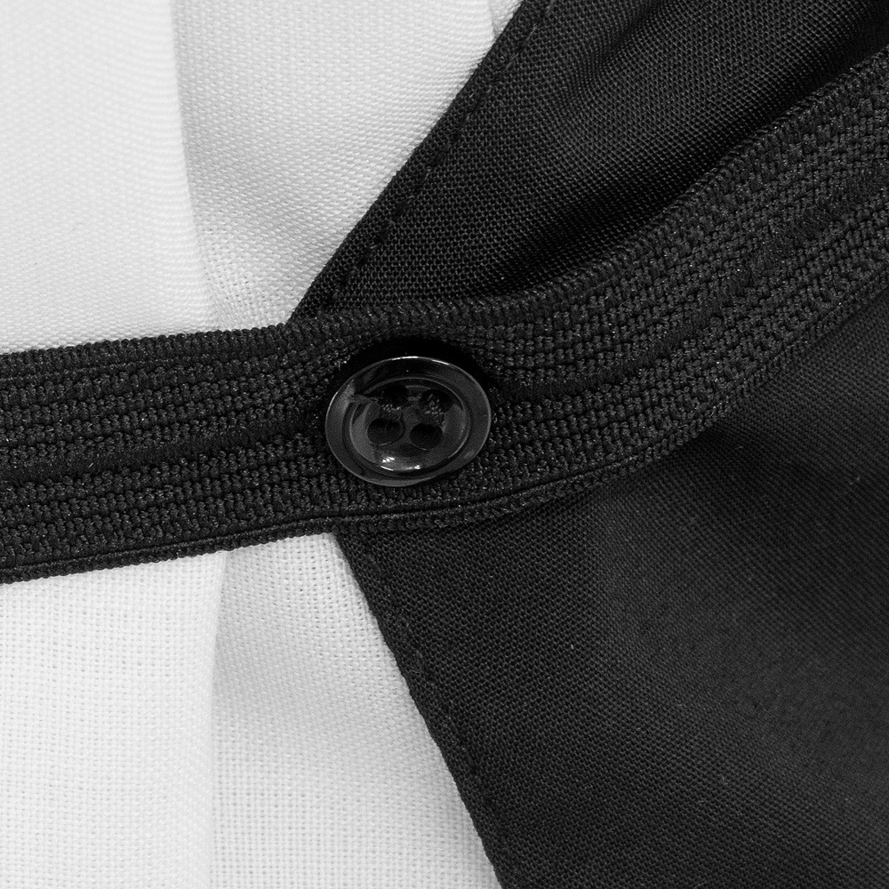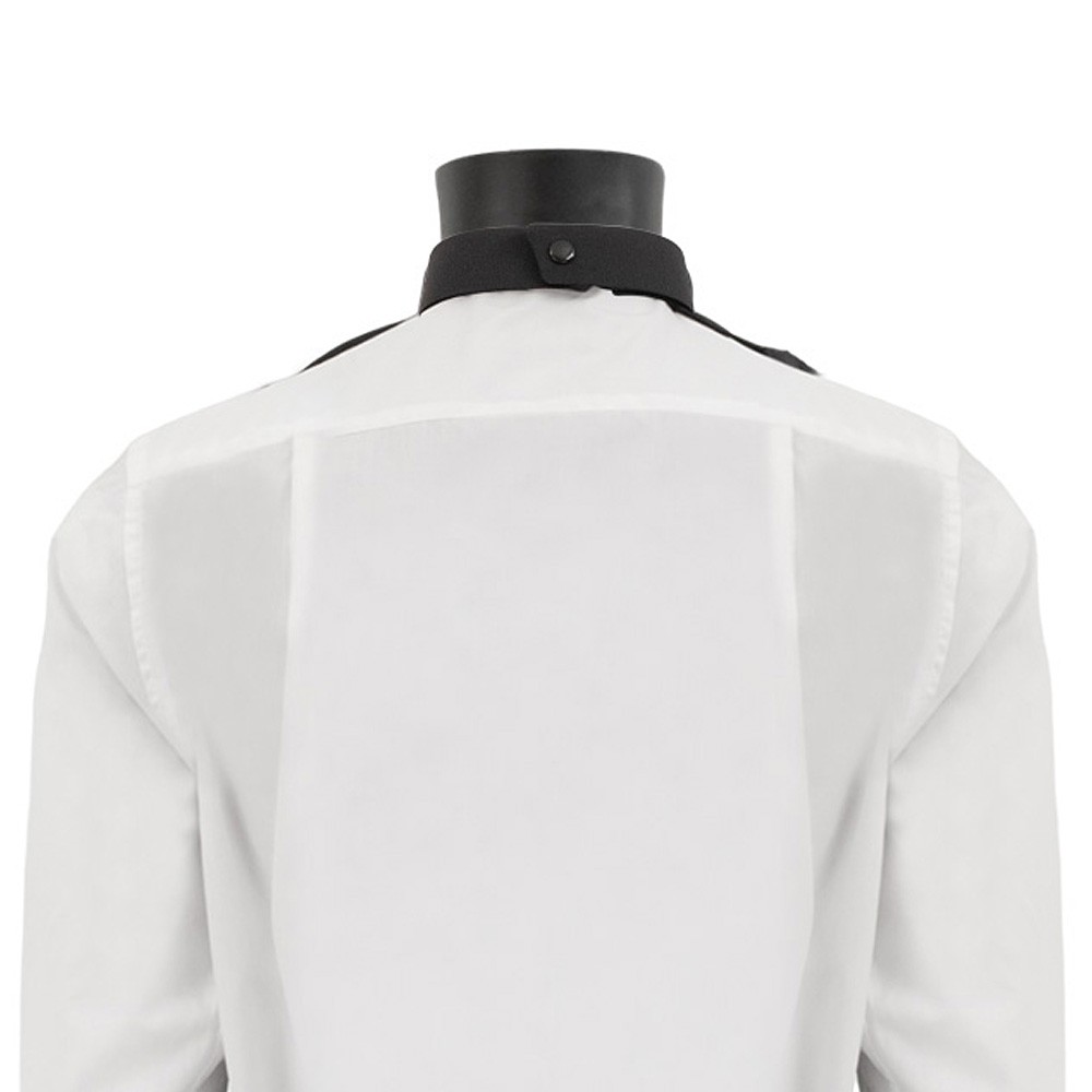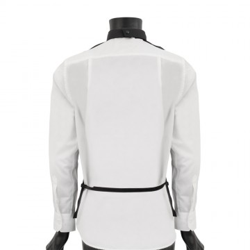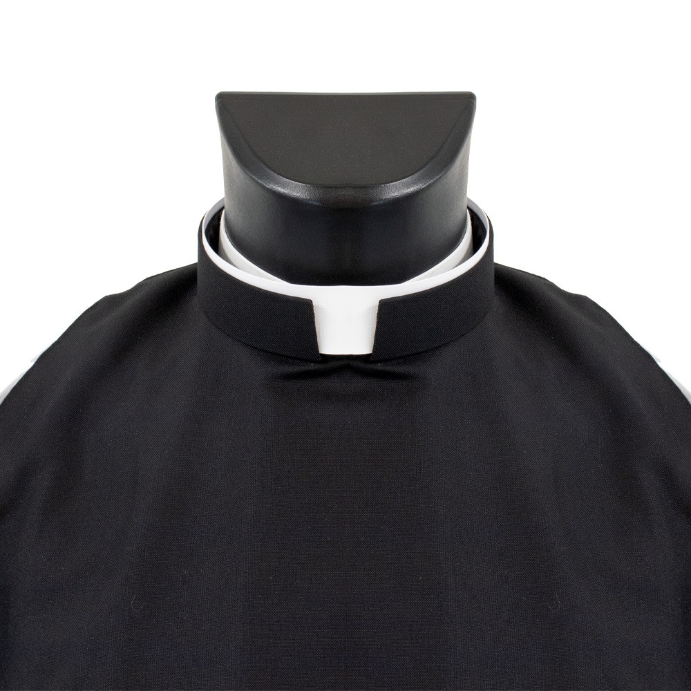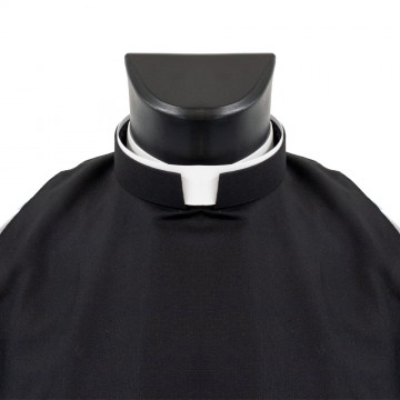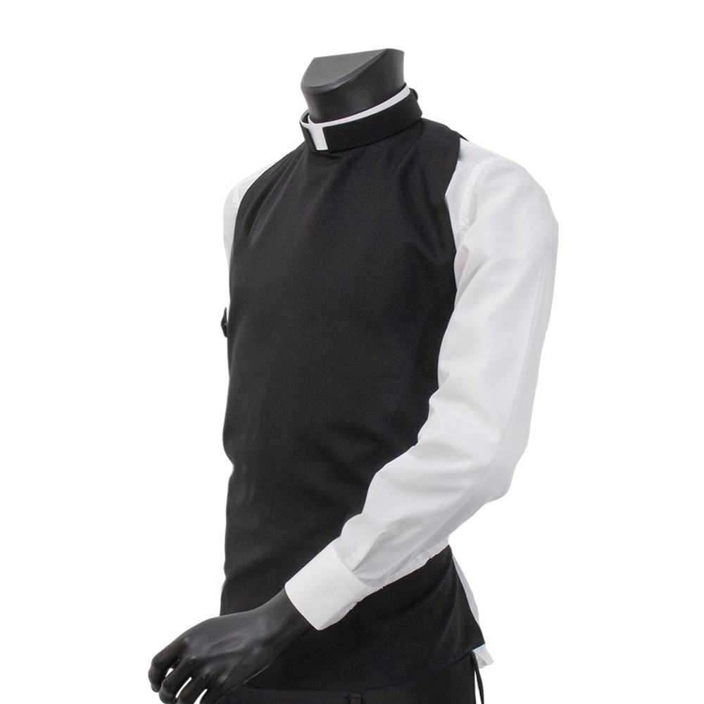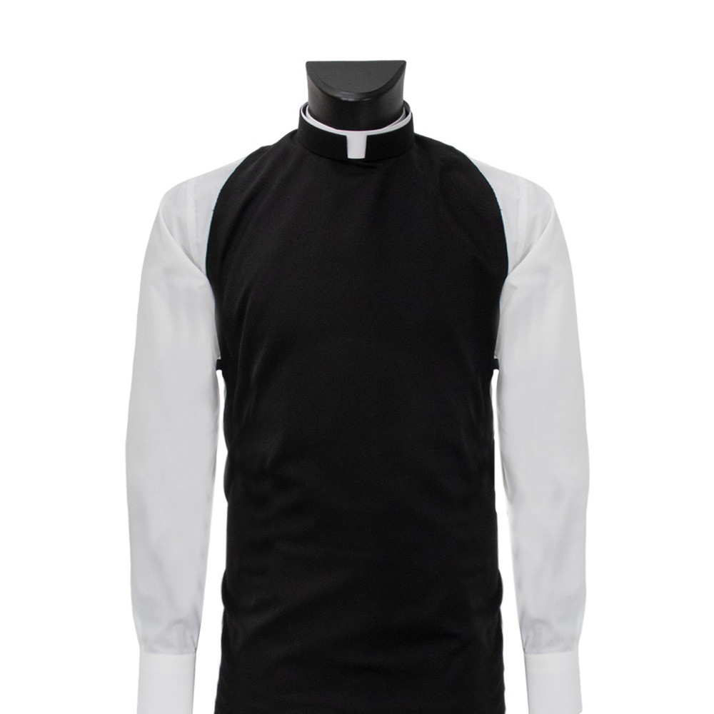 Black liturgical bib with Roman collar and adjustable elastic waist.