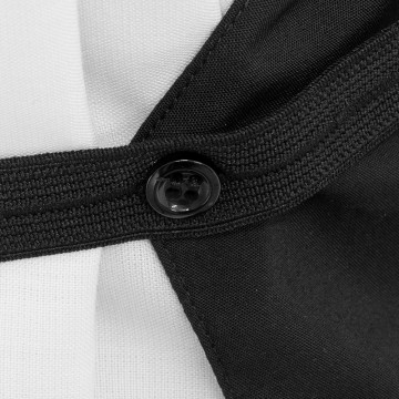 The bib is made of a fabric blend with 65% polyester and 35% cotton, featuring a neck closure and adjustable elastic waist.