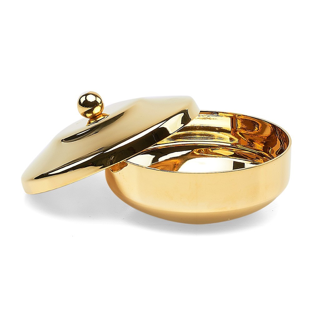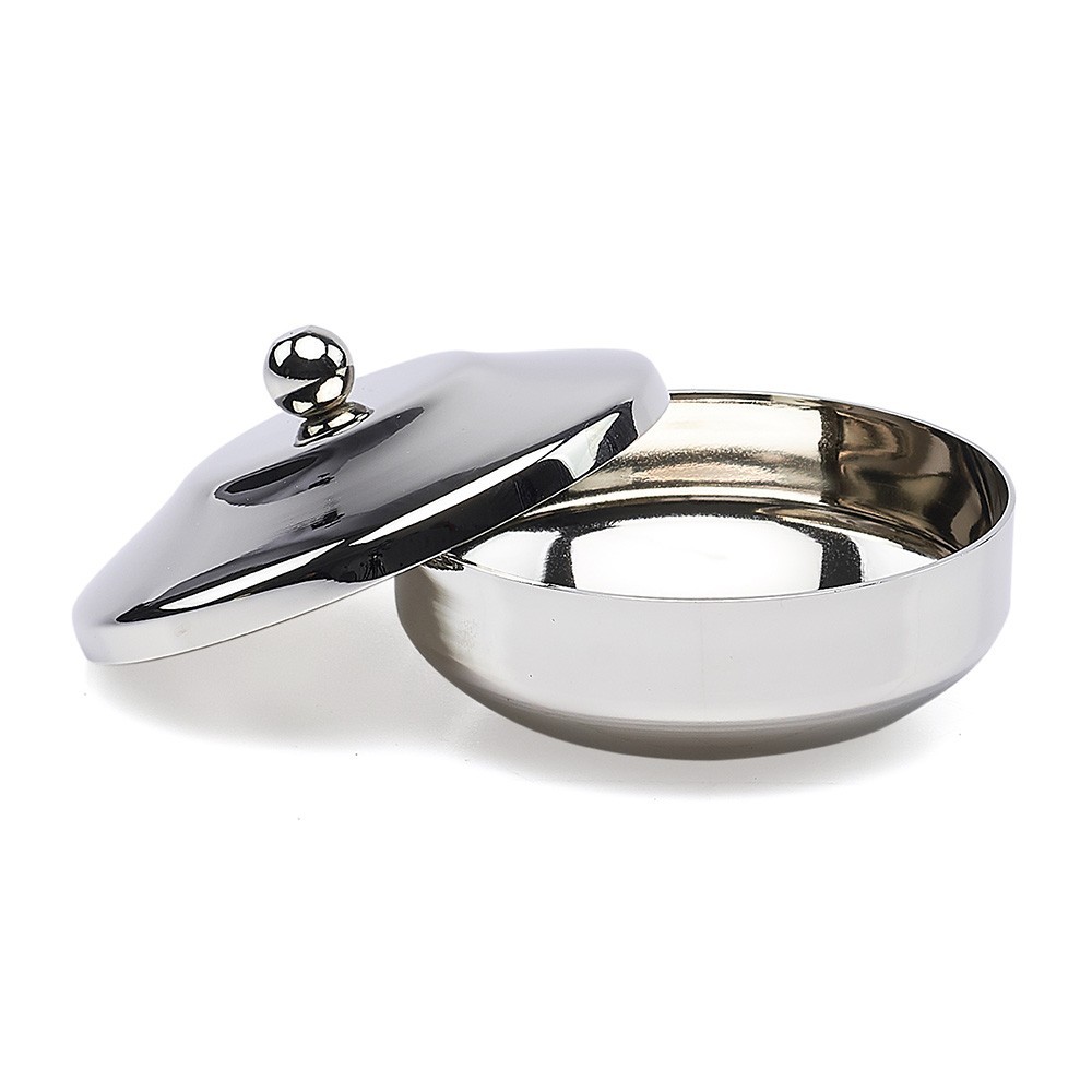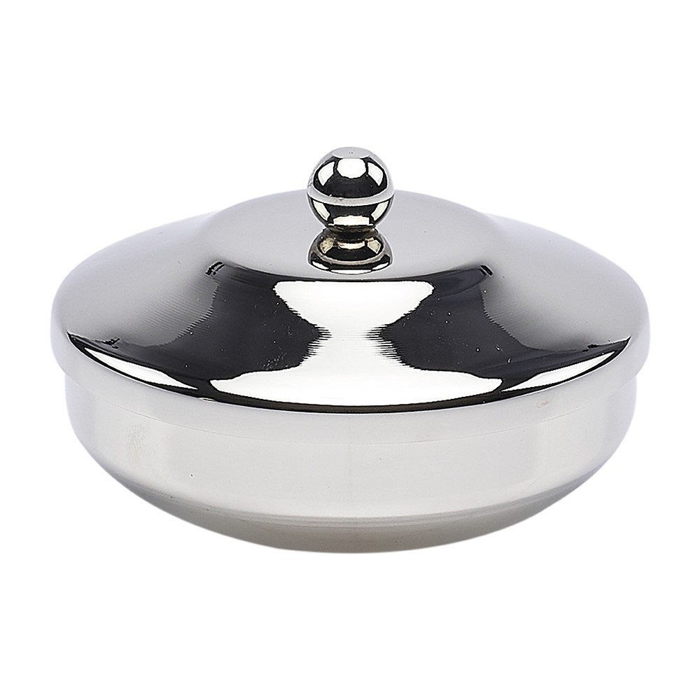 Boat for thurible made of nickel plated brass. It is 5 cm tall and has a diameter of 7.5 cm.