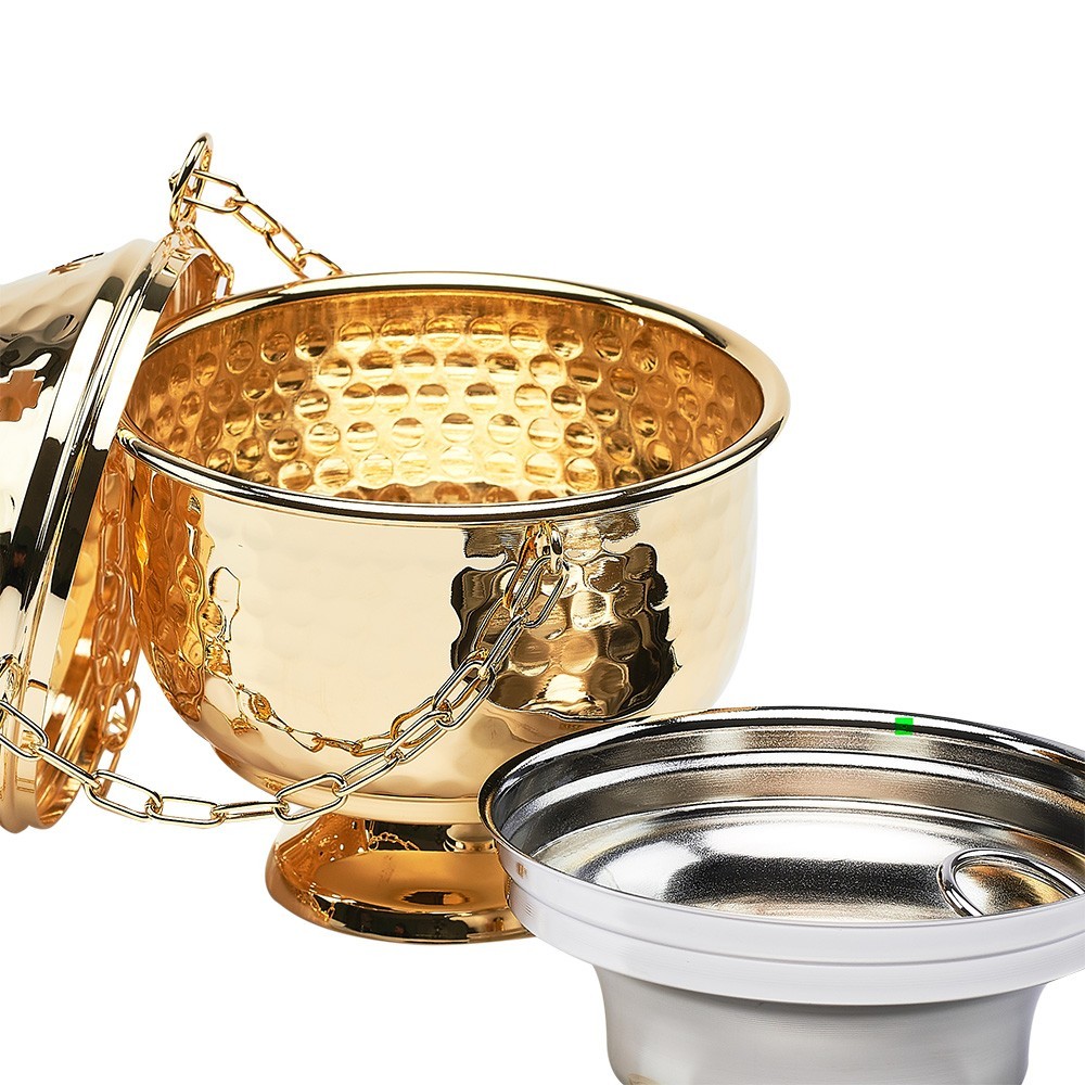 Thurible in golden brass. Complete with chains and a removable basket that can be easily washed. The lid has small holes which allow the dispersal of the scent.