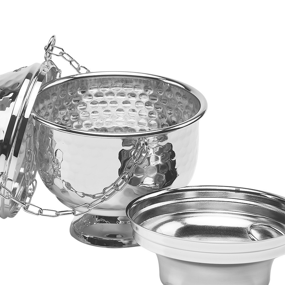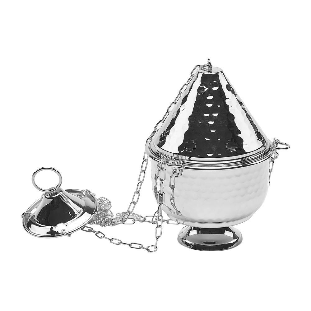 Thurible made of brass in silver finish. The lid has small holes that allow the dispersal of the scent. Complete with chains and a removable burner.