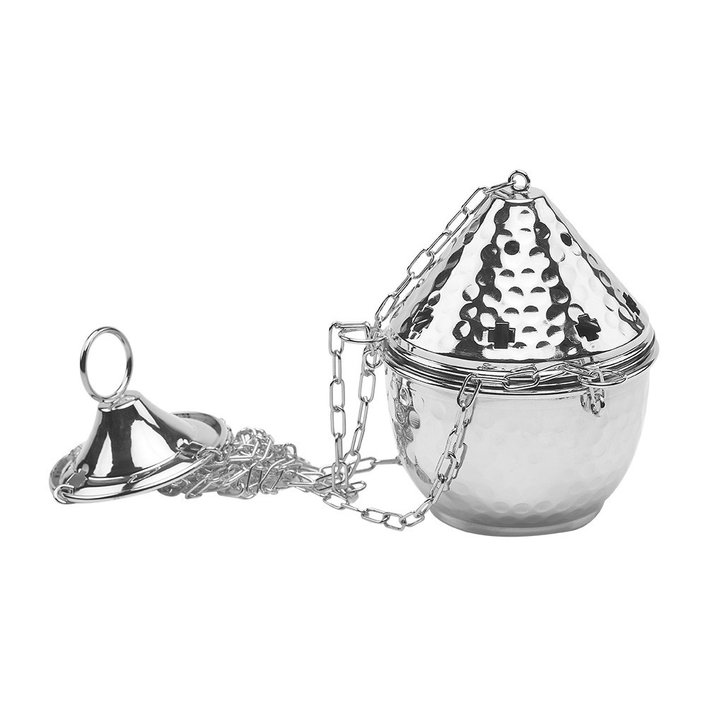 Thurible made of nickel-plated brass with hammered lid. The lid has small holes which allow the dispersal of the scent.