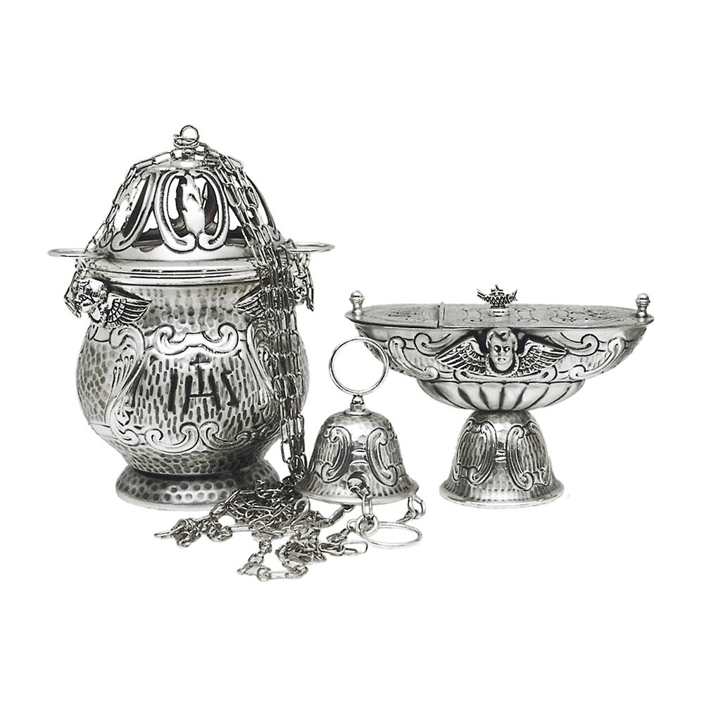 Matching thurible and boat finely chased by hand, decorated and hammered on the bottom. Enriched with JHS and Pax symbols and adorned with Angels. The boat has a traditional elongated shape and is provided with a spoon and removable inner basket.