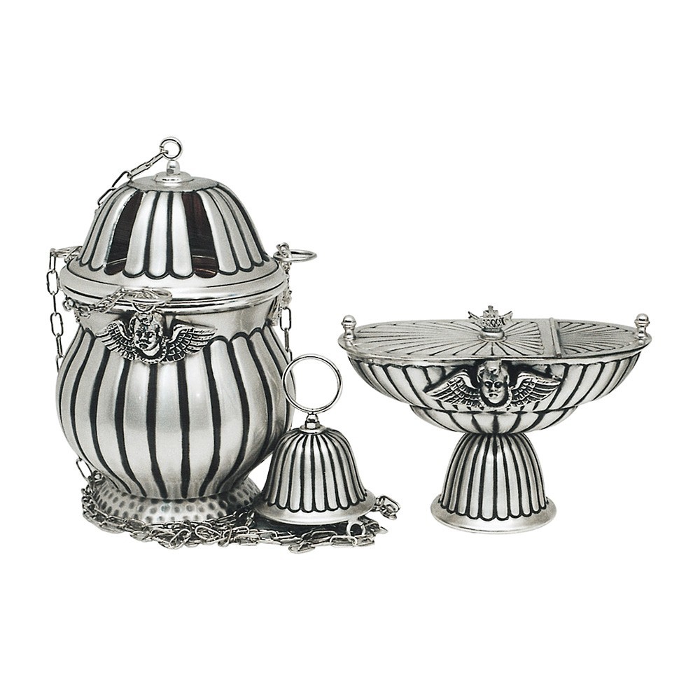 Matching thurible and boat in brass entirely chased by hand. The boat has the traditional elongated shape and is complete with spoon. Its interior can be removed.