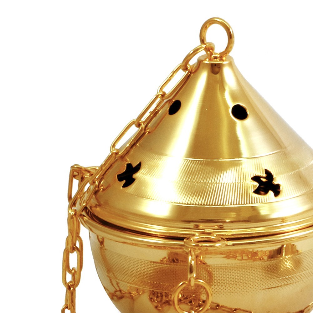 Thurible made of brass available in gold and silver finish. The lid has small dove-shaped, round holes which allow the dispersal of the scent.