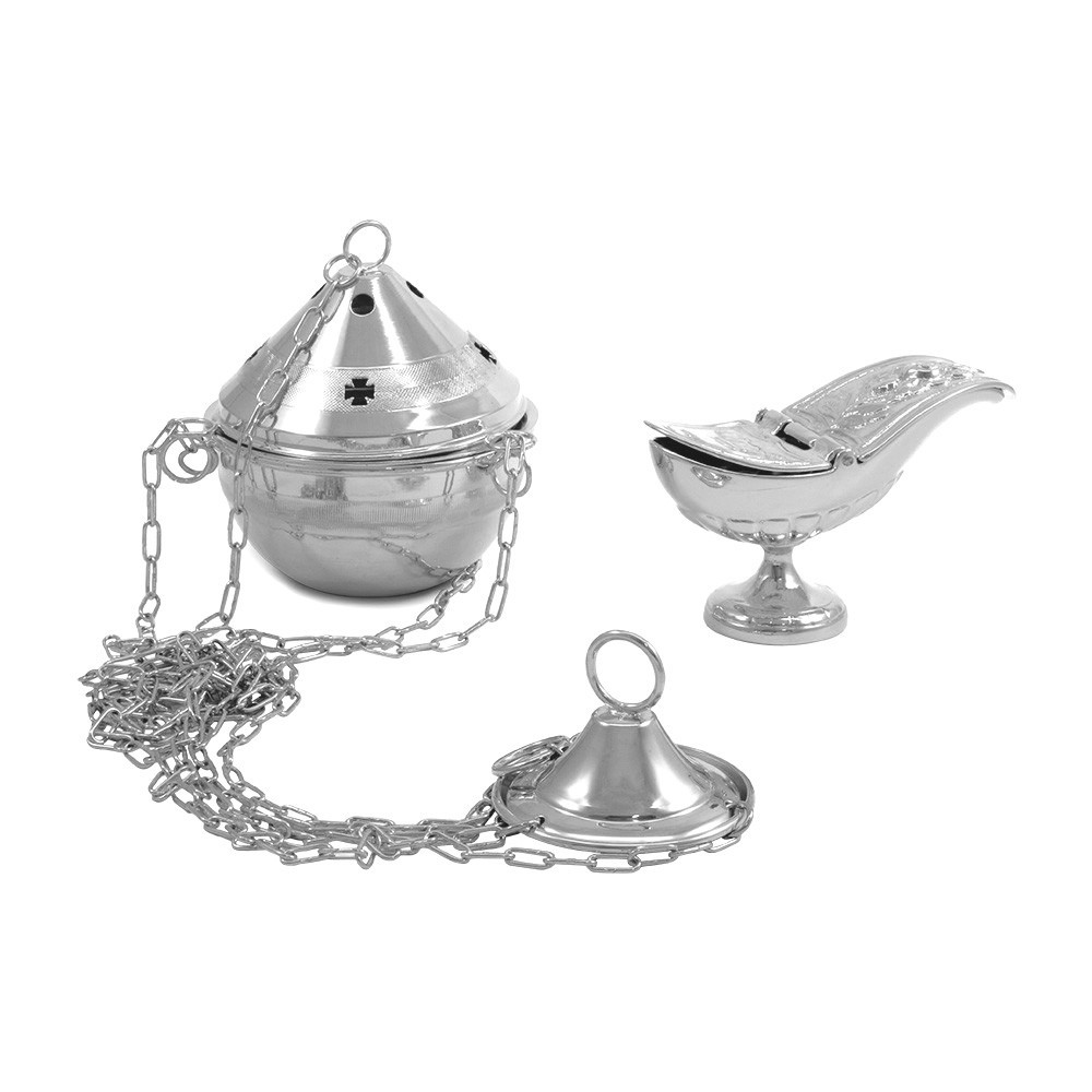 Thurible for incense complete with boat. Both items are entirely made of silver-plated brass. The lid has small holes which allow the dispersal of the scent