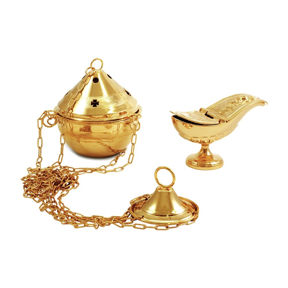 Thurible in brass with gold finish complete with boat for incense. The lid has small holes which allow the dispersal of the scent.