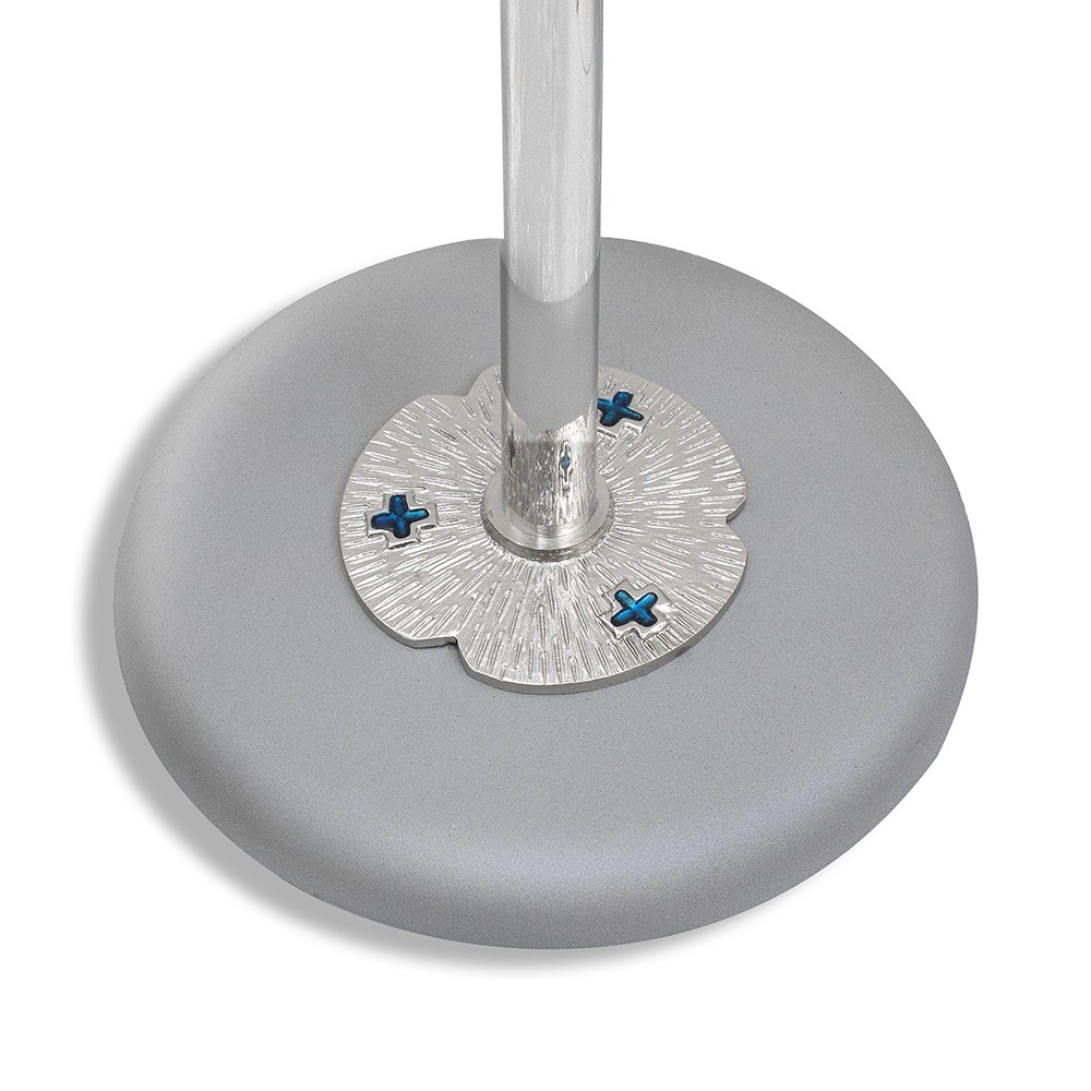 Thurible holder in brass with polished silver finish. The round base is made of metal and decorated with blue stones. Complete with hook for the thurible and support for the boat.