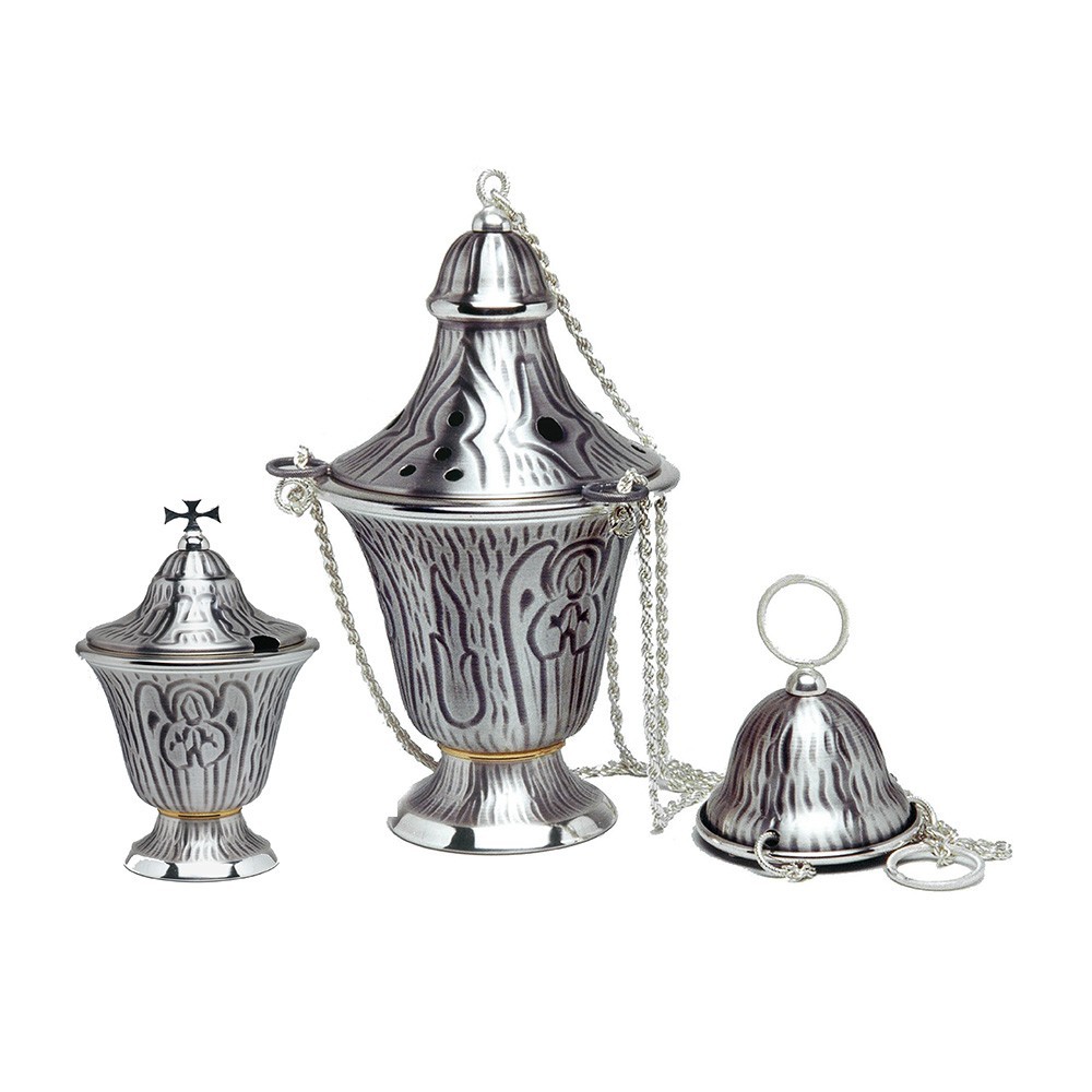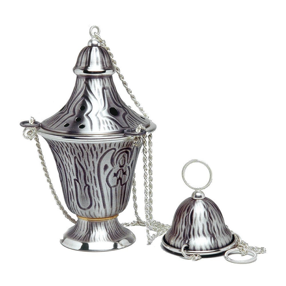 Matching thurible and boat in brass. Made of silver-plated brass, entirely chased by hand. These items are practical and manageable thanks to their small size. Product of excellent quality entirely made in Italy.