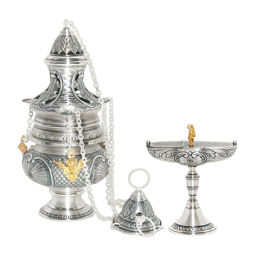 Thurible, boat and bucket set in silver-plated brass.