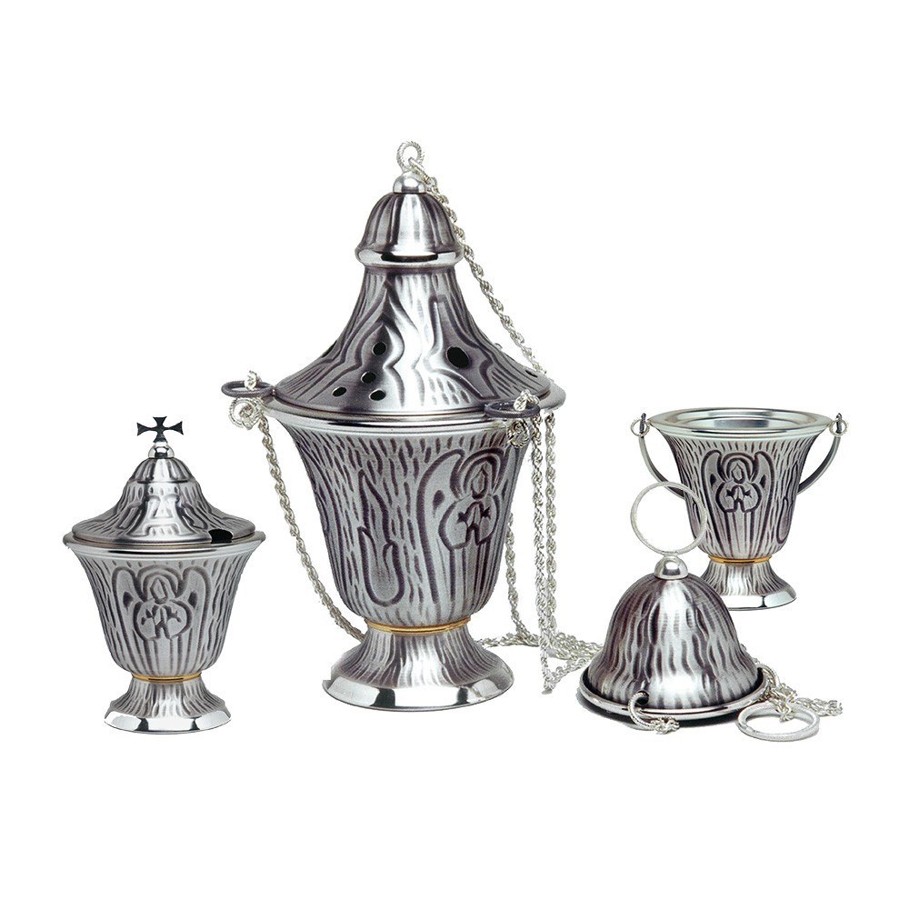 Complete set consisting of thurible, boat and bucket. Made of silver-plated brass, entirely chiseled by hand. Excellent quality product made in Italy.