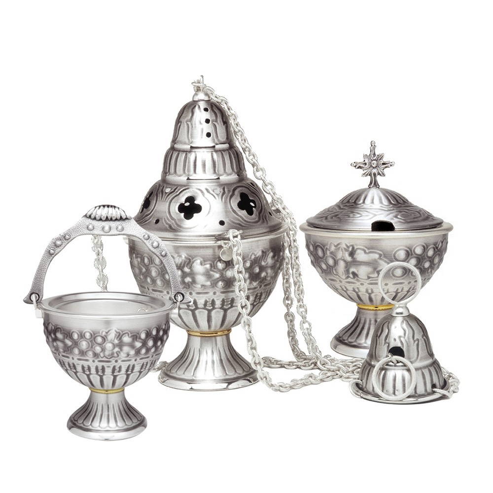 Matching thurible, boat and bucket made of silver-plated brass. Entirely chased by hand. Excellent quality product entirely made in Italy.