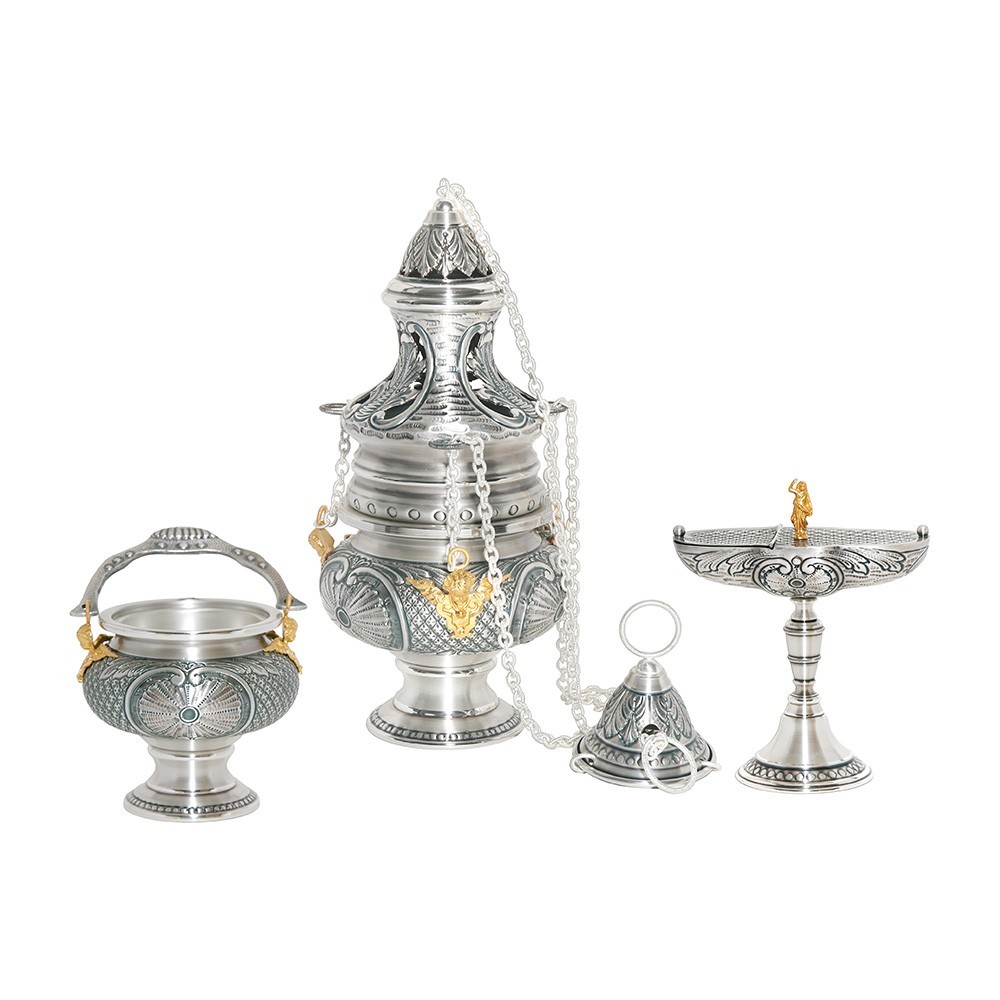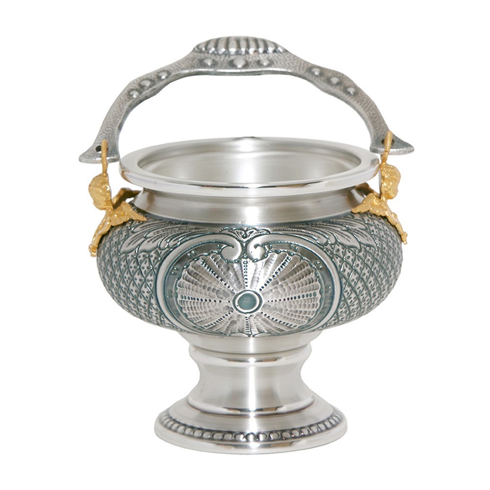Set consisting of thurible, boat and bucket. The set is made of silver-plated brass and finely chased by hand. It’s embellished with shell-shaped decorations and golden angels. High-quality product of great beauty, entirely made in Italy.