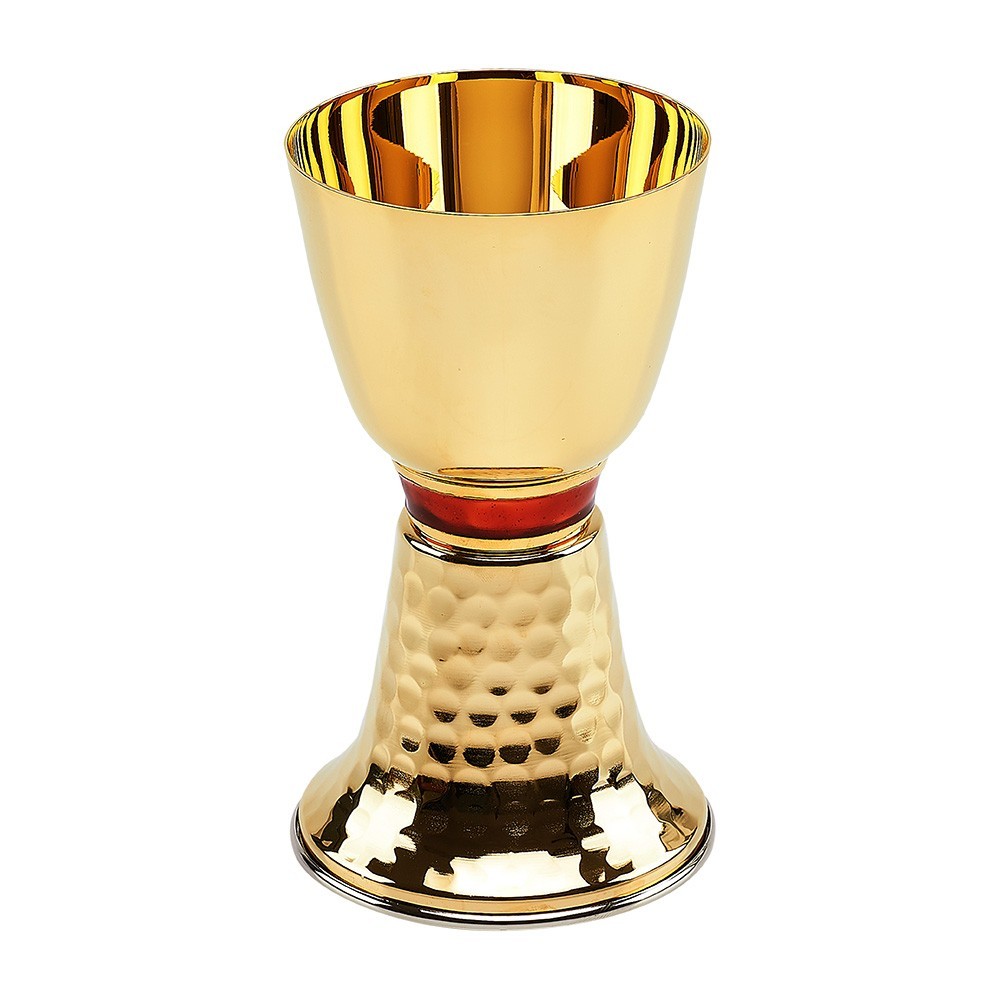 Mass chalice entirely made of gold-plated brass with enameled loop of red color. The chalice base is slightly decorated.