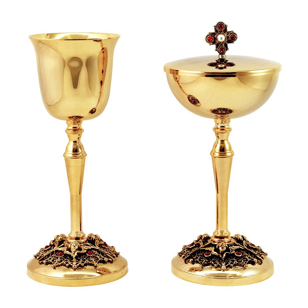 Chalice and Ciborium in 24k gold-plated brass with floral base.