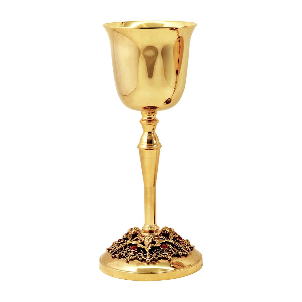 Chalice in chiseled brass with JHS symbol and grape leaves.