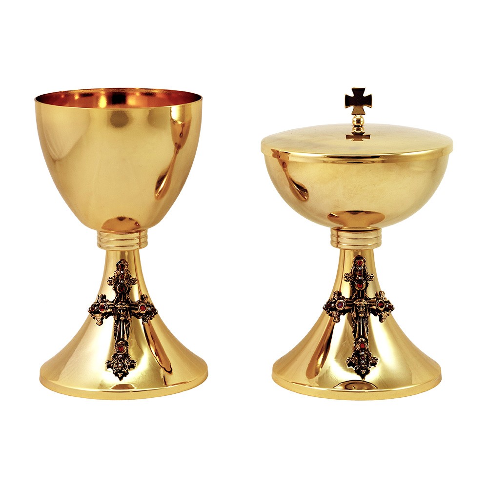 Church set complete with chalice and ciborium, ‘Jesus’ model. This altar set is entirely made of 24k gold-plated brass. A special and beautiful feature is the Baroque cross in antique bronze. It is placed both on the ciborium and on the chalice. Enriched with red stones.