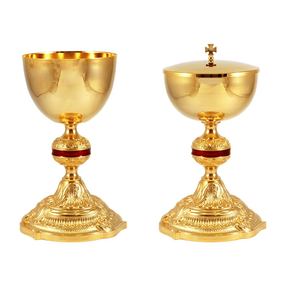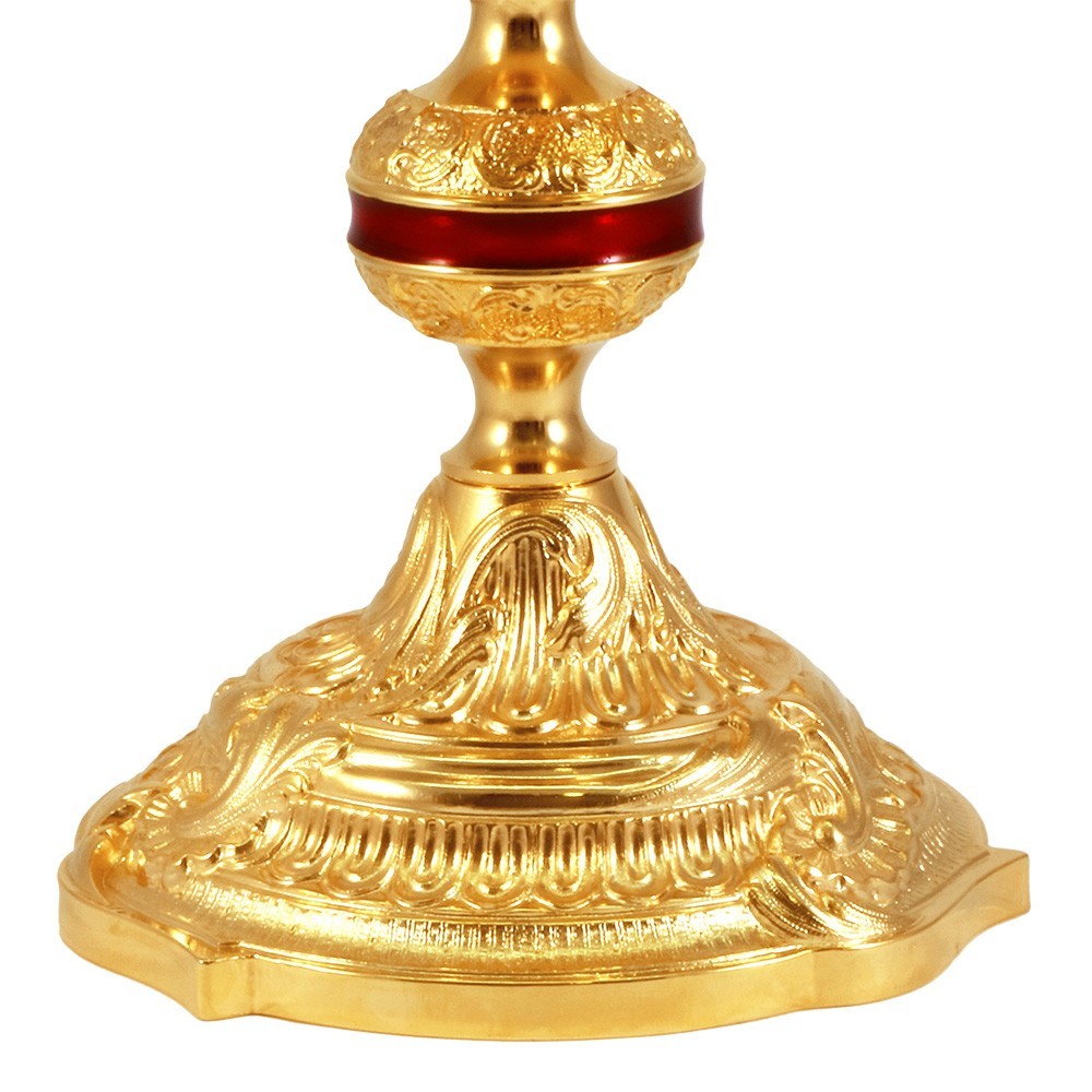 Set consisting of chalice and ciborium for concelebration. It’s made of 24k gold-plated brass. The base is decorated using the casting technique, while the node is enameled in red. Church item of excellent quality and well-finished, entirely made in Italy.