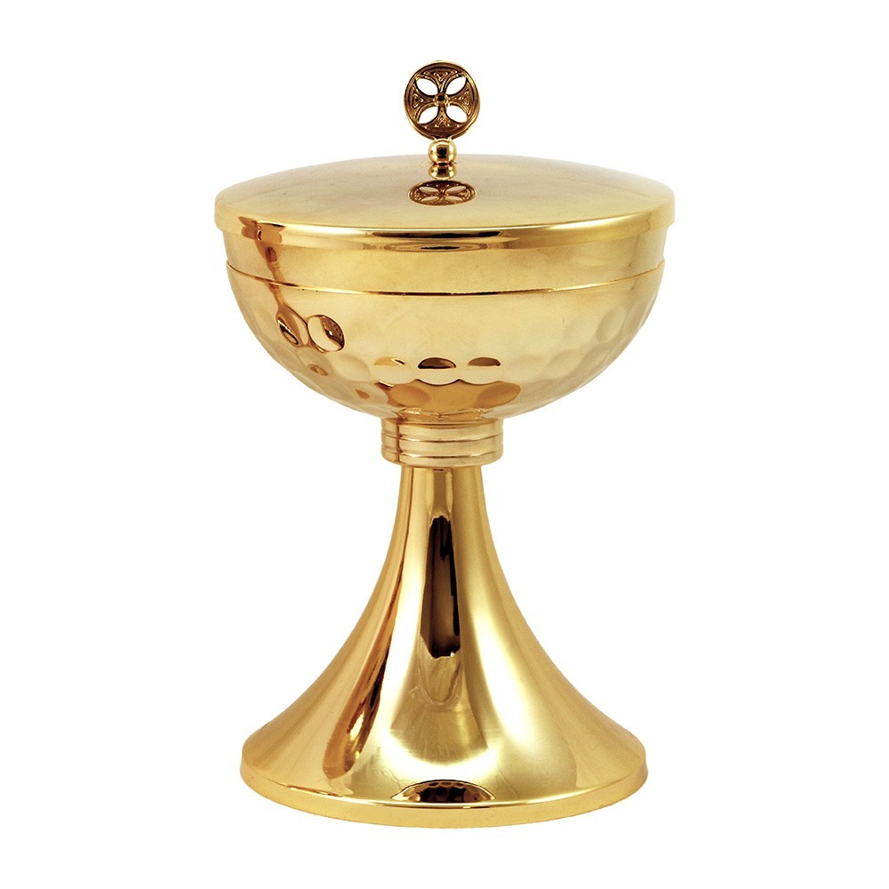 Chalice and ciborium in brass with hammered base and cup bottom.