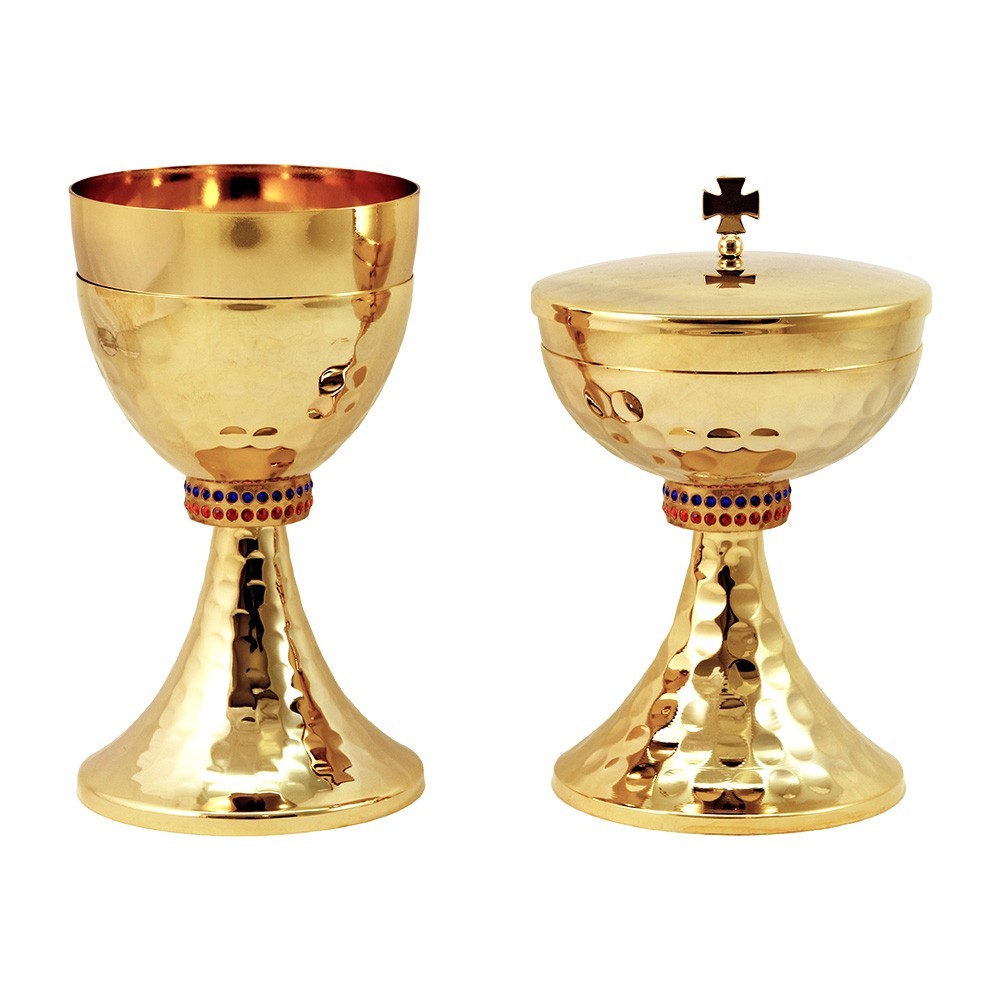 This liturgical set consists of a chalice and a ciborium entirely made of gold-plated brass with base and sub-cup decorated using the hammering technique.