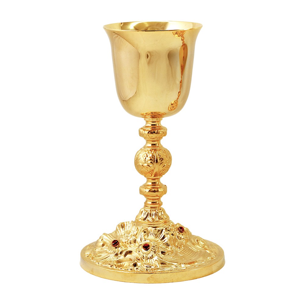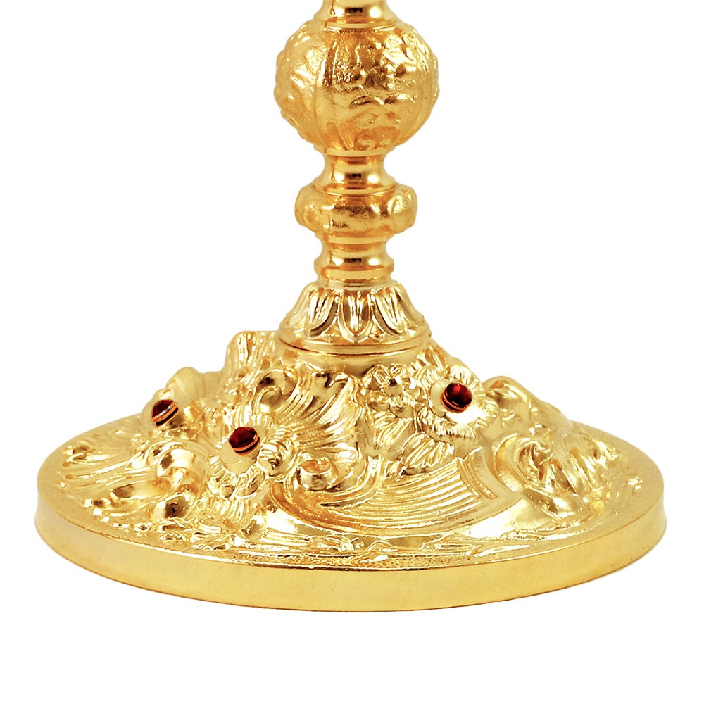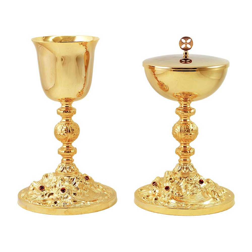 Set of chalice and ciborium with finely decorated base depicting roses and enriched with red stones. Both sacred items feature a base decorated using the casting technique.
