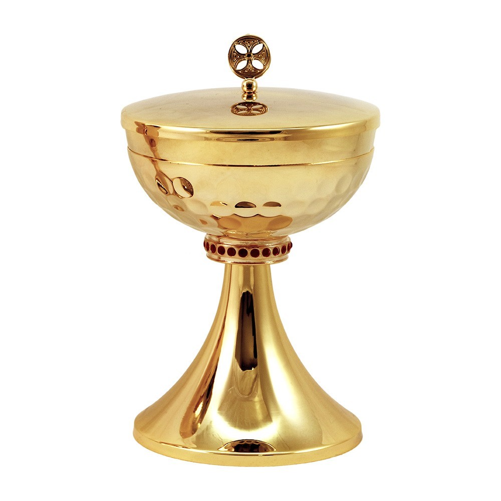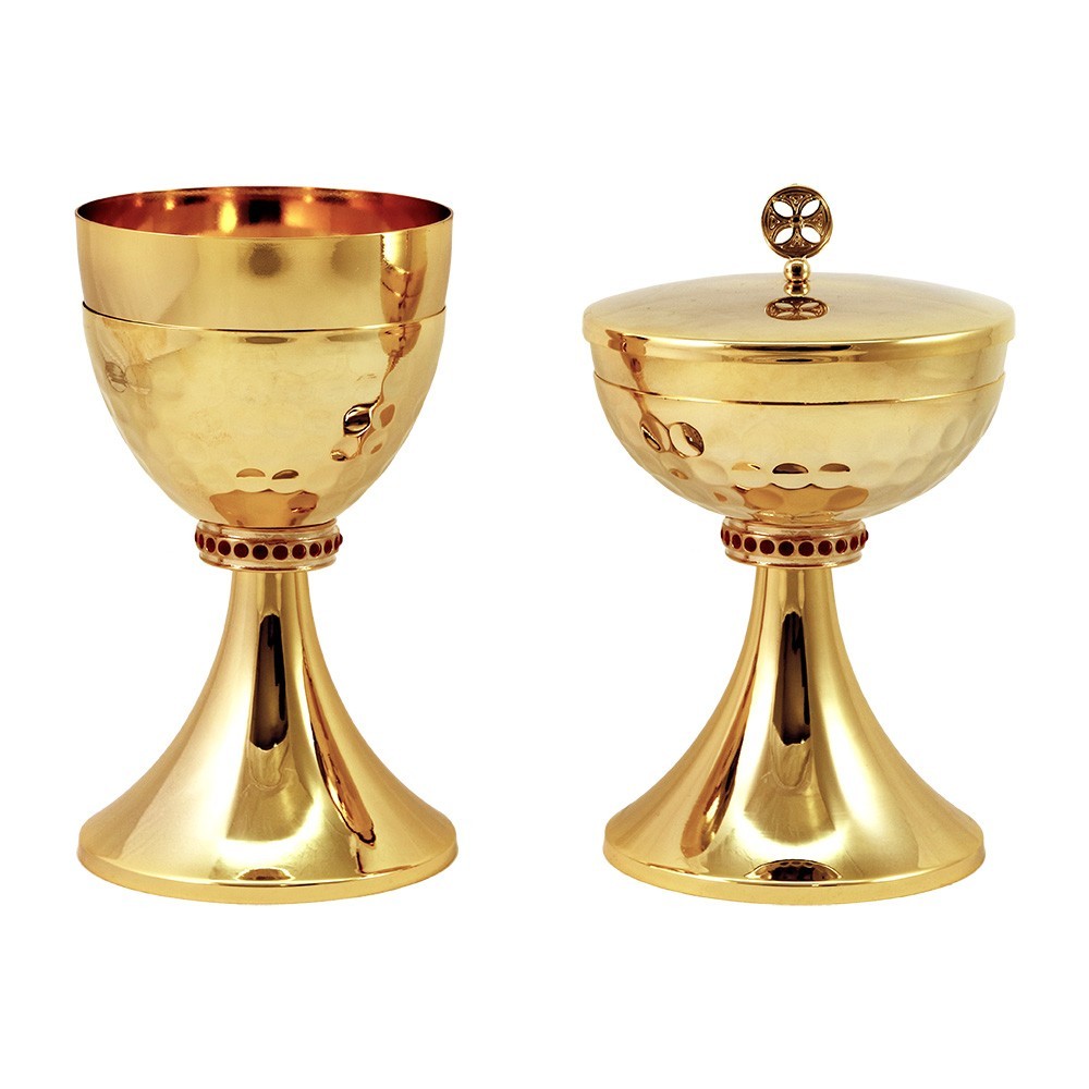 This liturgical set consists of chalice and ciborium entirely made of 24k gold-plated brass. The bottom of the cup is decorated using the hammering technique, while the node is cast with embedded red stones.