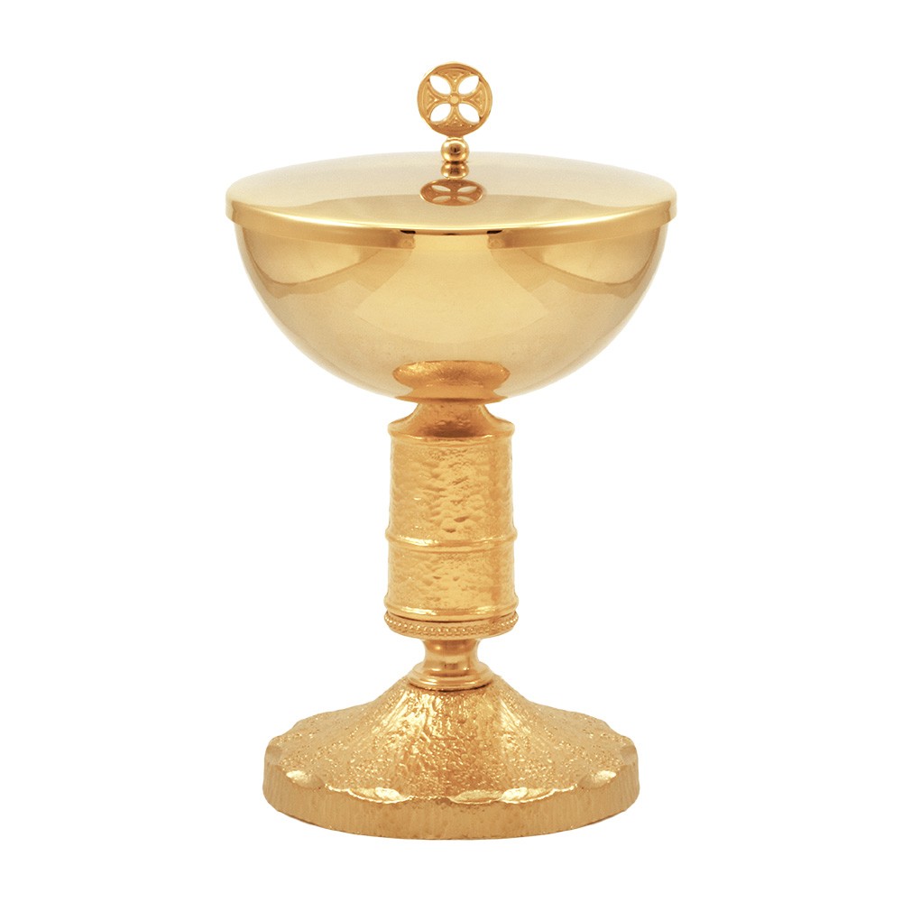Chalice and ciborium in golden brass with hammered base and sub-cup.