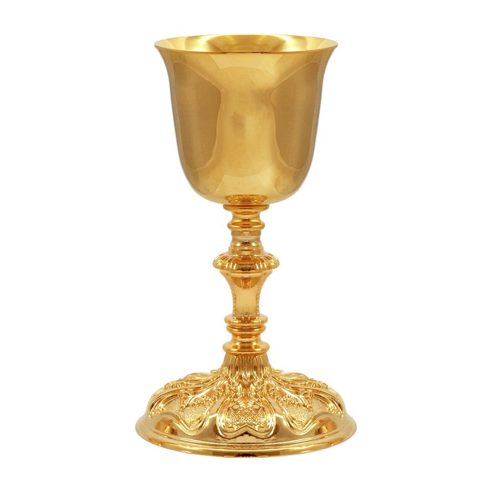 Mass chalice in brass with guaranteed 24k gold plating. This elegant chalice features a finely decorated cast base and a knop in Baroque style.