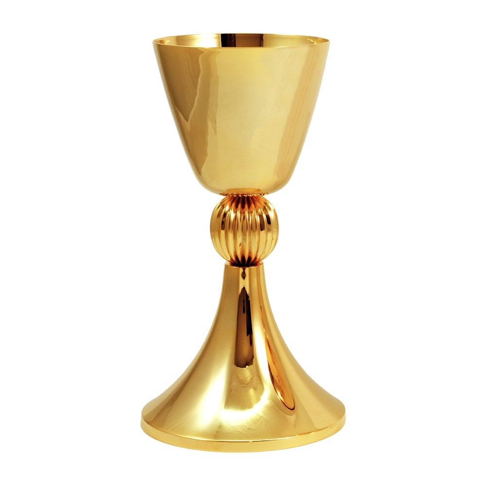 Chalice in golden brass with polished base and cup. Striped node.