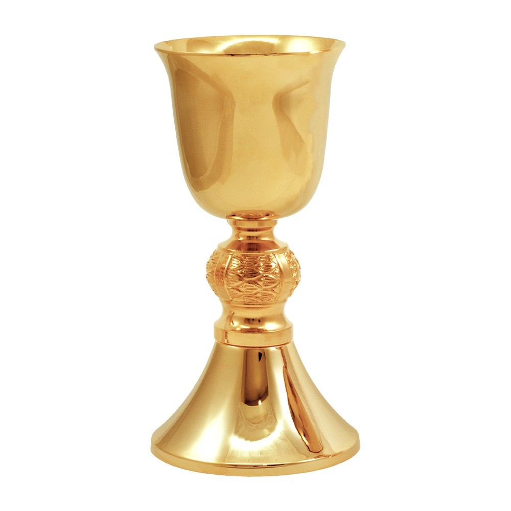 Chalice with polished brass base and cup. Elliptical node with oxidized finish.