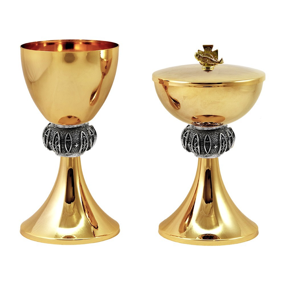 Set of Chalice and Ciborium in gold-plated brass with 'Cross and Grapes' node.