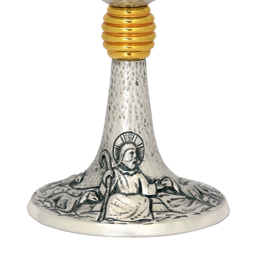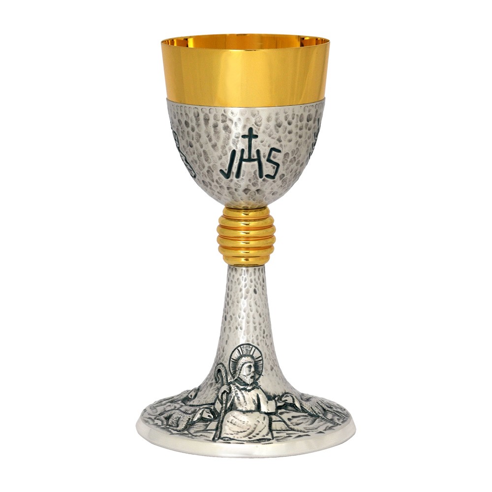 The cup is entirely made of gold metal and has a decorated JHS symbol. The base shows a wonderful representation of Jesus the Good Shepherd.