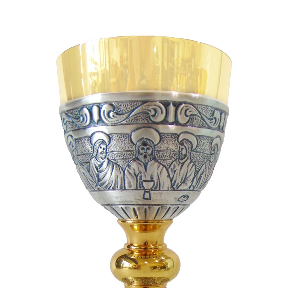 The cup is made of metal with both gold and silver finish; the base is made of silver-plated brass. The cup and the base are embellished with a representation of the Last Supper.