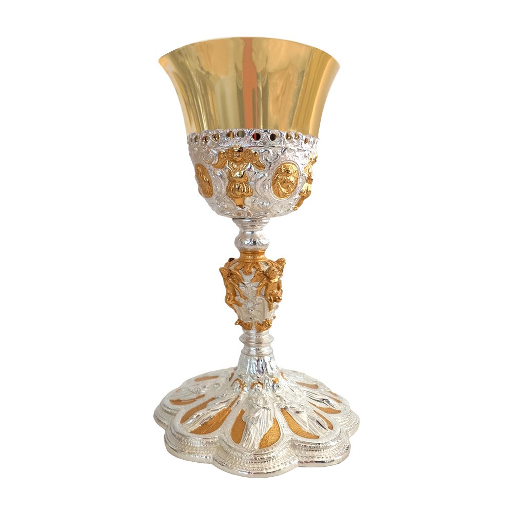 This chalice for Mass is made of bicolor cast brass with satin finish. Its base is finely decorated with saints, while the node and the cup feature angels decorations.