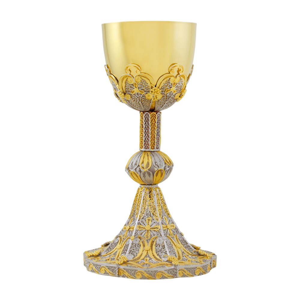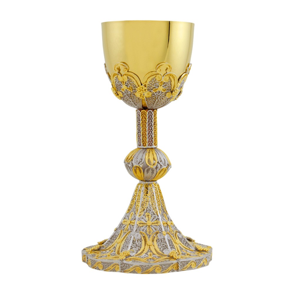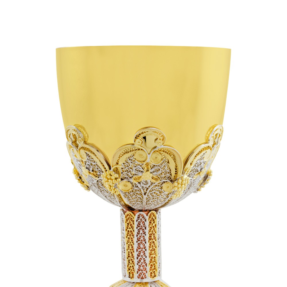 Communion chalice with 'Cross and Grapes' decorated node, 18.5 cm tall.