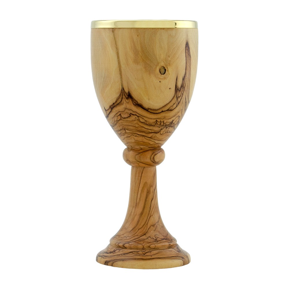 This chalice is 20 cm tall and is made of olive wood with inner cup in 800 silver, in order to protect wood from religious wine seepage.